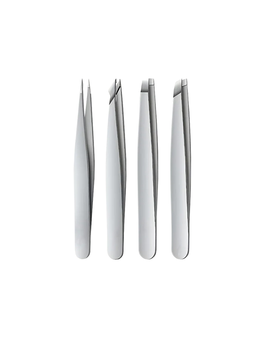 Conjunto com 4 pinças profissionais, ideal para cuidados pessoais e remoção precisa de pelos, especialmente na zona das sobrancelhas. Fabricadas em aço inoxidável com acabamento de alta qualidade, proporcionam uma depilação eficaz, confortável e sem esforço.